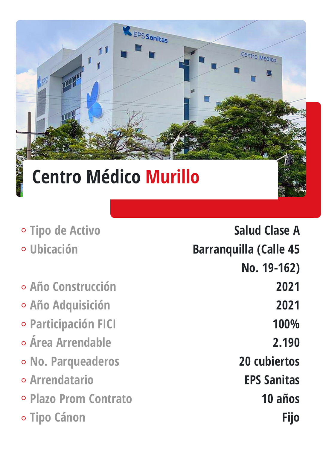 Especializados: El portafolio cuenta con 2 inmuebles especializados en salud, ubicados en dos ciudades Barranquilla y Bogotá.
