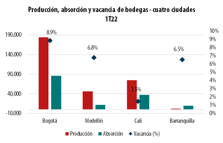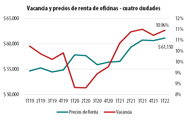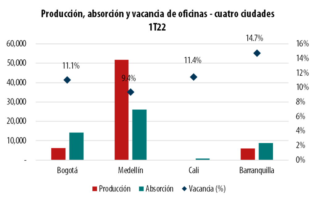 A pesar del incremento en la absorción (ocupación) de este sector, el mercado de oficinas mostró un ascenso de la vacancia, pasando del 10.70% al 10.96% entre el último trimestre de 2021 y el primer trimestre de 2022, generado por un aumento en la oferta de espacios en Medellín. Por su parte, en Bogotá se mantuvo estable (11.1%), mientras en Barranquilla (14.7%) y Cali (11.4%) hubo un descenso de áreas disponibles.