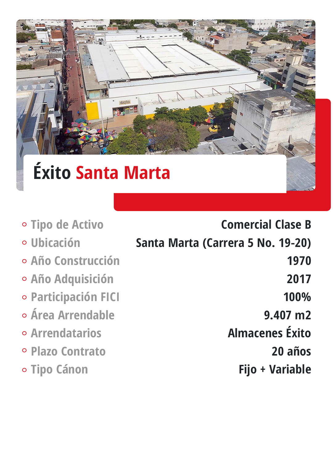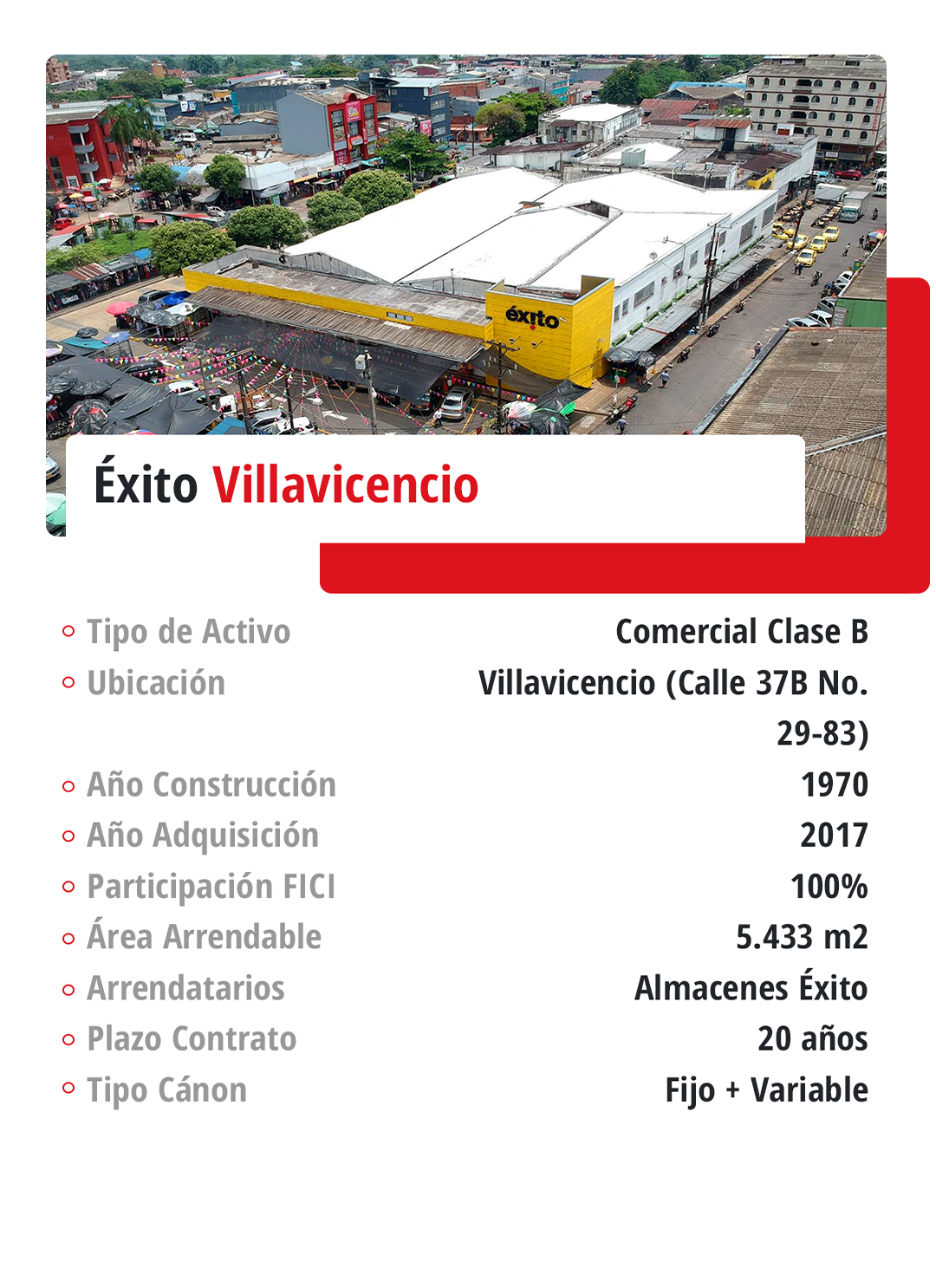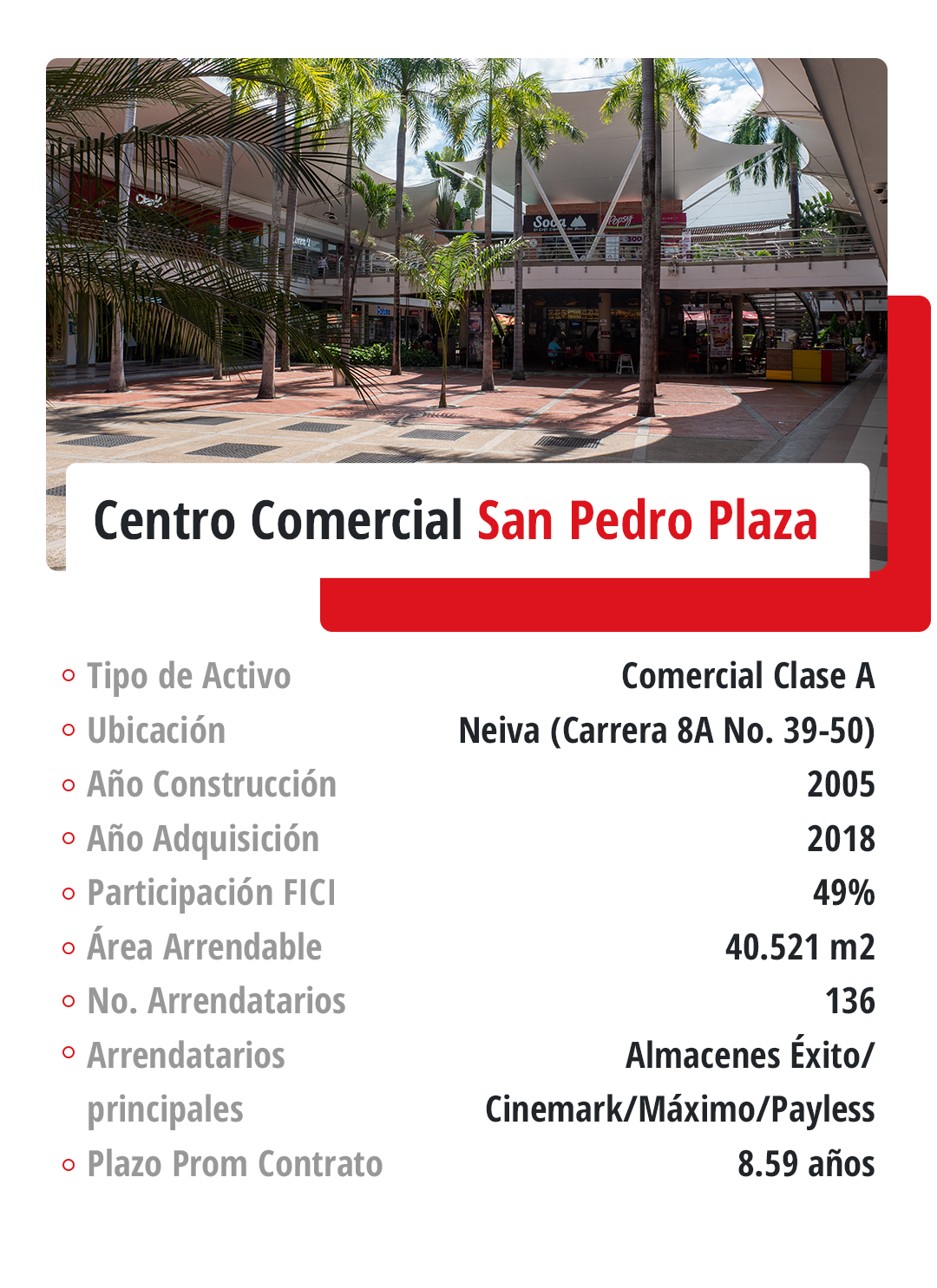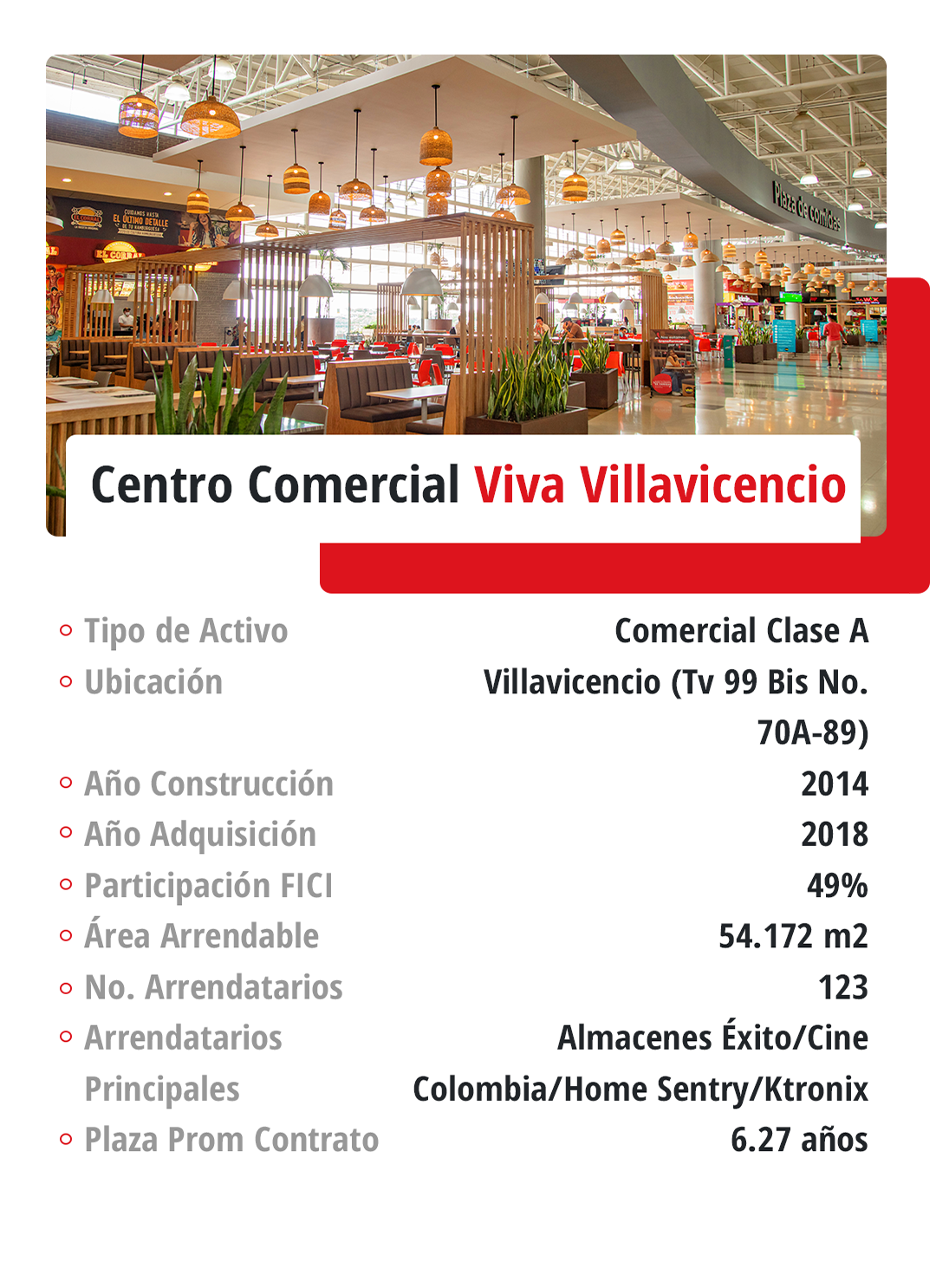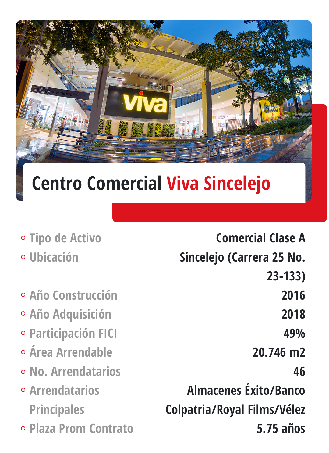 Fondo Inmobiliario de Renta cuenta con 49 activos con presencia en más de 20 municipios y ciudades de Colombia. Teniendo en cuenta la relevancia y dinamismo de la capital en el desarrollo del sector de la construcción y demás industrias, además de las altas especificaciones de los inmuebles en esta ciudad y su importancia en el PIB nacional, el Fondo presenta una mayor exposición a propiedades ubicadas en Bogotá (48,00%), seguido de Villavicencio y Neiva (20,94% y 11,72% respectivamente) debido a que los centros comerciales Viva Malls de mayor tamaño están ubicados en estas ciudades.