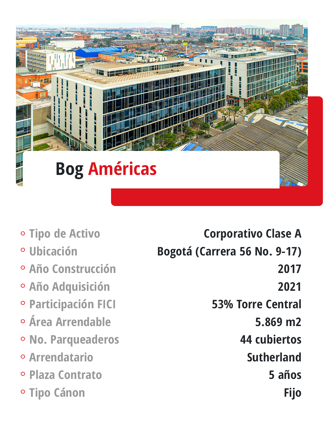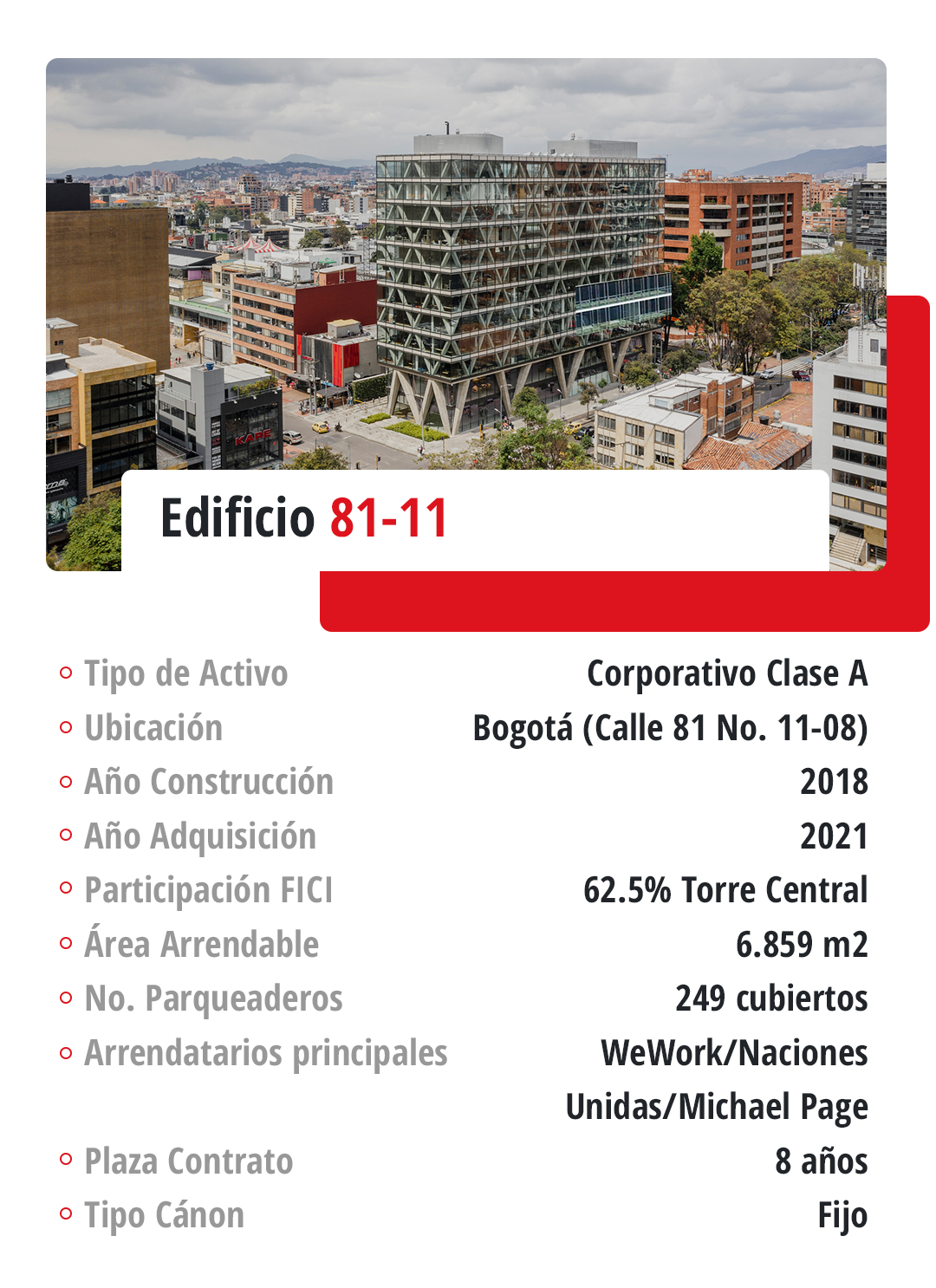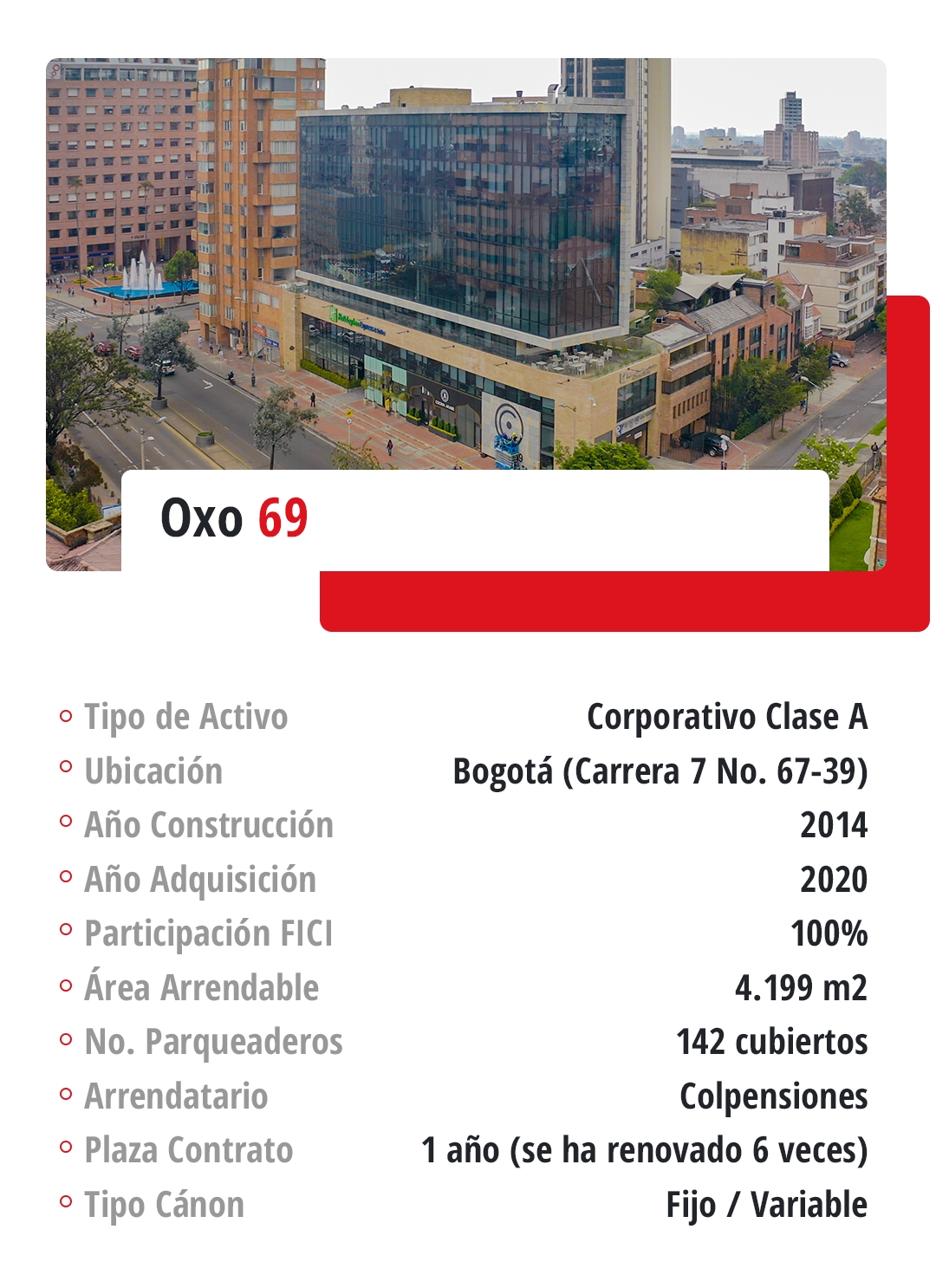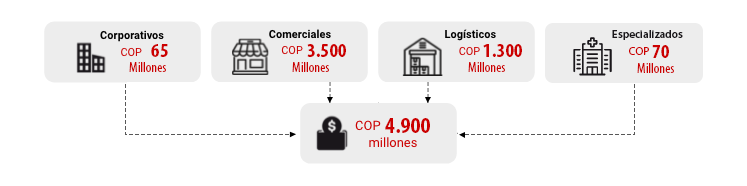 Corporativo: El Fondo cuenta con seis activos corporativos de las mejores especificaciones, ubicados en la ciudad de Bogotá y en la ciudad de Cali.