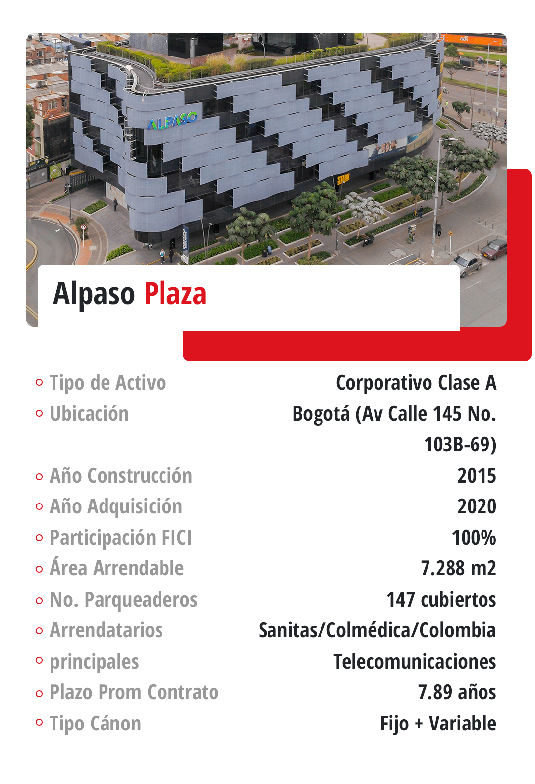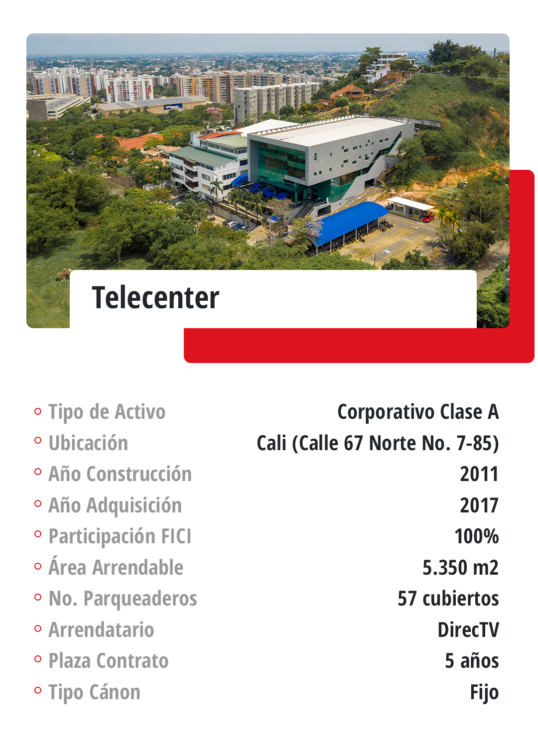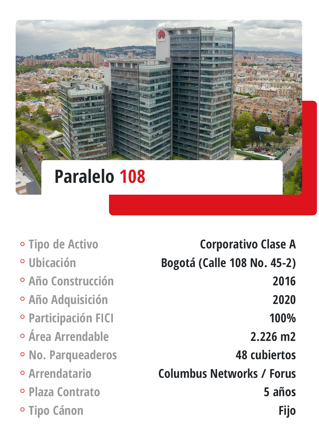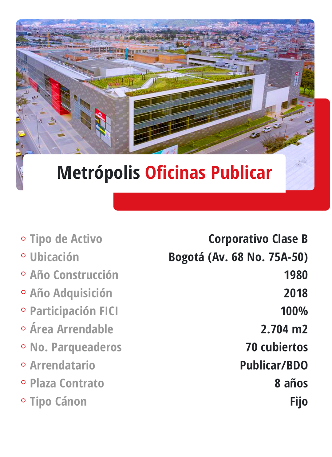 Corporativo: El Fondo cuenta con seis activos corporativos de las mejores especificaciones, ubicados en la ciudad de Bogotá y en la ciudad de Cali.