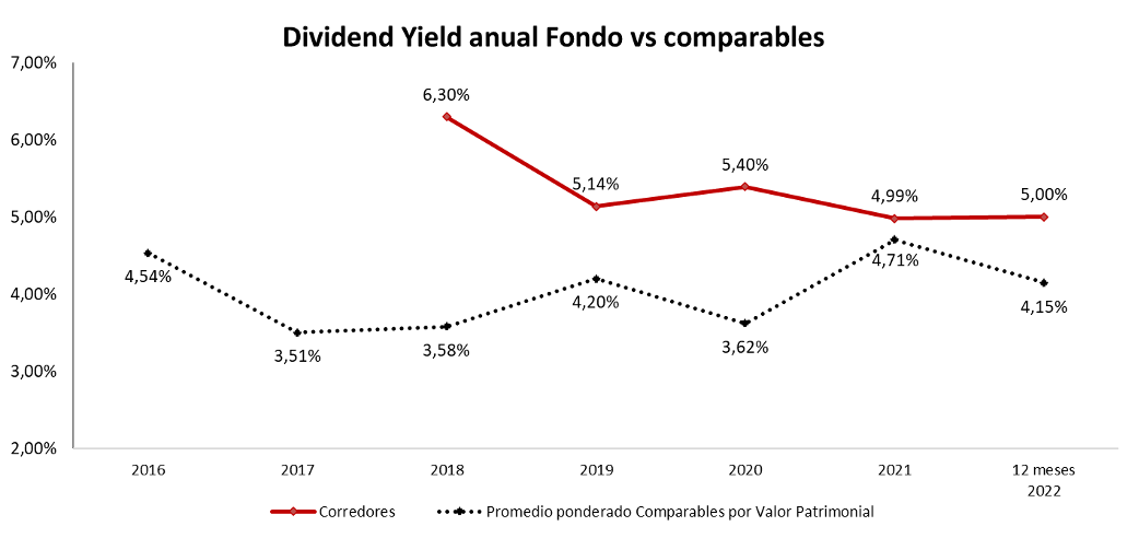 Con esto, el dividend yield del Fondo Inmobiliario de Renta se ubicó en 5,00% para el cierre del primer semestre de 2022. Como se puede ver en la gráfica inferior, este resultado es superior en 85 pbs al de los comparables y posiciona al Fondo como el segundo vehículo inmobiliario con mejor retorno por dividendo en el año.