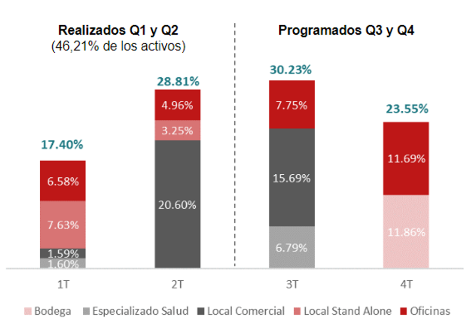 En relación con el cronograma de ejecución de los avalúos comerciales, durante el primer semestre del año se han realizado los avalúos de 39 activos que representan el 46.21% del total de los ingresos del portafolio, que corresponden a los inmuebles arrendados a Grupo Éxito, Telecenter, Centro Médico Murillo, Oxo 69, Portafolio Davivienda, Oficinas Publicar y el Centro Comercial Viva Villavicencio. Estos avalúos tuvieron un comportamiento positivo en total del 6.8% superior en comparación con los avalúos de los mismos inmuebles en el año 2021.