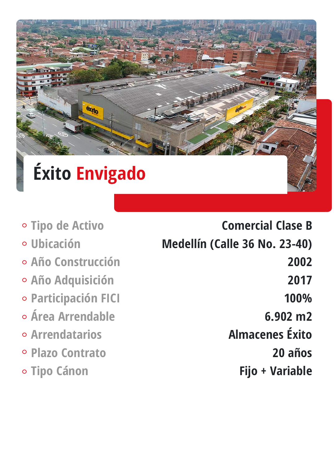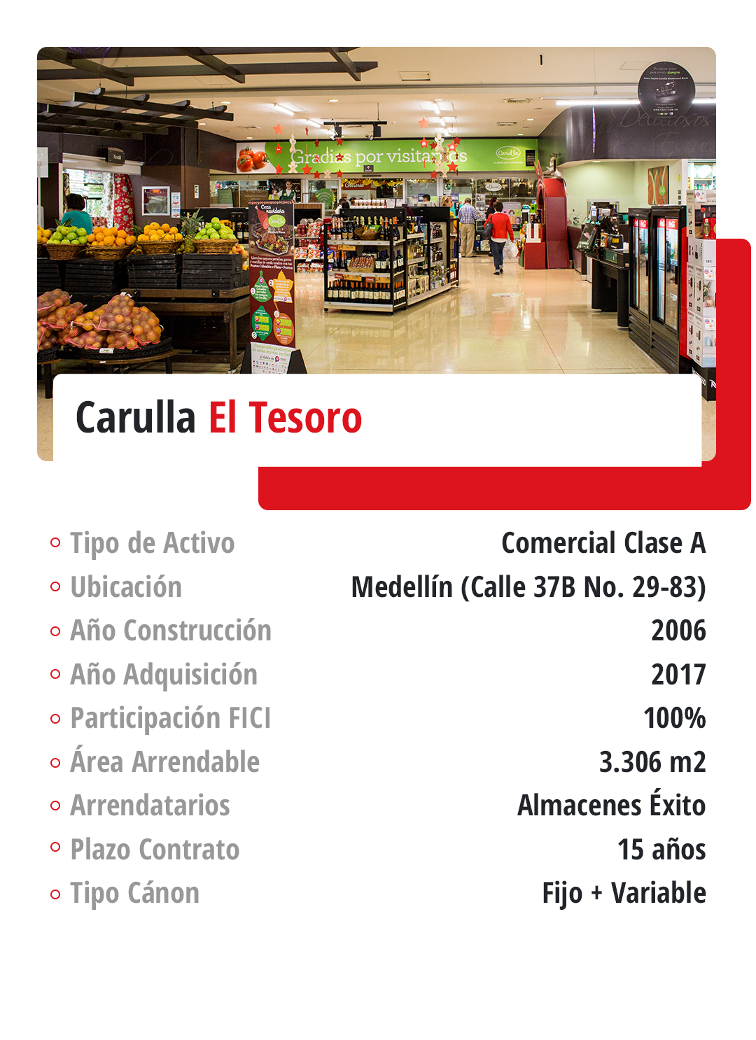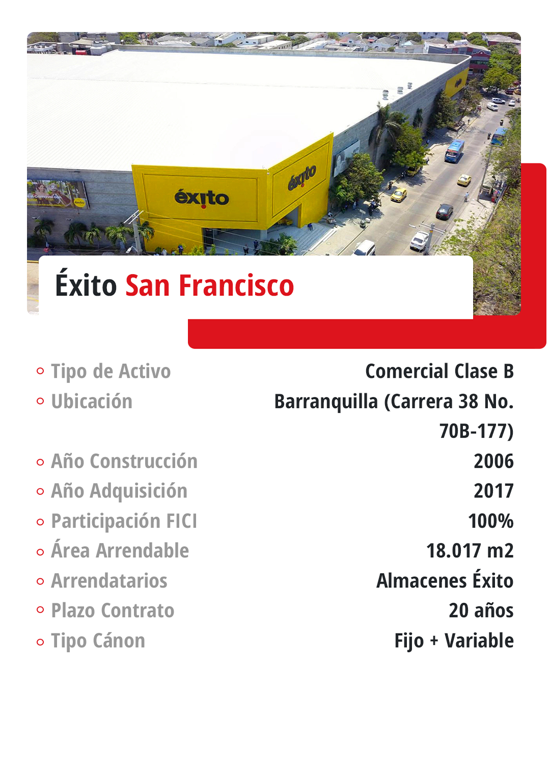 Comercial: En cuanto al portafolio de inmuebles retail o comerciales, se incluyen centros comerciales, locales dentro de centros comerciales y locales stand alone, distribuidos en diversas ciudades y municipios a nivel nacional.