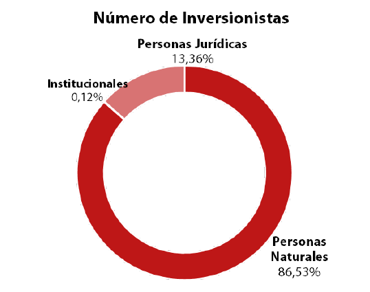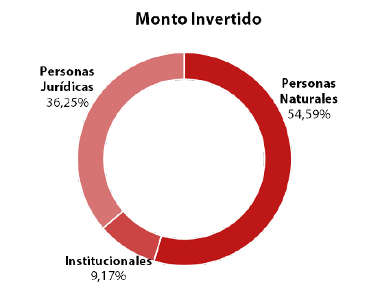 Con base en lo anterior, la composición medida por número de inversionistas muestra que el 86,53% equivale a inversionistas personas naturales, el 13,36% corresponden a personas jurídicas y el 0,12% hace referencia a inversionistas institucionales. De otro lado, al realizar la composición de acuerdo con el monto invertido, la mayor parte es representada por personas naturales (54,59%), seguido de personas jurídicas (36,25%) e institucionales (9,17%).