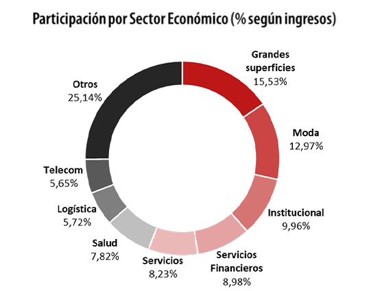 Los más de 250 arrendatarios del Fondo se encuentran diversificados en más de 10 sectores económicos entre los cuales se destacan: grandes superficies con una participación del 15,53% (liderado por Grupo Éxito), el sector moda (12,97%), que continúa con la recuperación que inició en el año anterior; el sector institucional con el 9,96% en donde el más importante es Colpensiones, que está ubicado en el edificio Oxo 69 en Bogotá; y el sector de servicios financieros que comprende una participación de 8,98% con las sucursales arrendadas a Banco Davivienda como mayor participante de esta categoría.