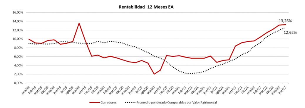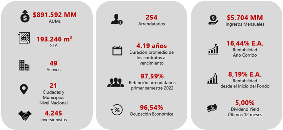 Teniendo en cuenta estos dos factores, gracias a la gestión activa realizada por el equipo Gestor y considerando la situación de reactivación del crecimiento económico en Colombia, el inicio de 2022 ha sido favorable para el Fondo en términos de rentabilidad que a 30 de junio se ubica en 13,26% E.A a 12 meses, compuesta por: i) 5,28% E.A. derivada de las cuatro distribuciones de rendimientos que se entregaron durante el último año y por ii) 7,58% E.A. a raíz de la valorización de los activos. Esta rentabilidad superó en 63 pbs el promedio ponderado por valor patrimonial de la rentabilidad de los comparables en ese mismo periodo.