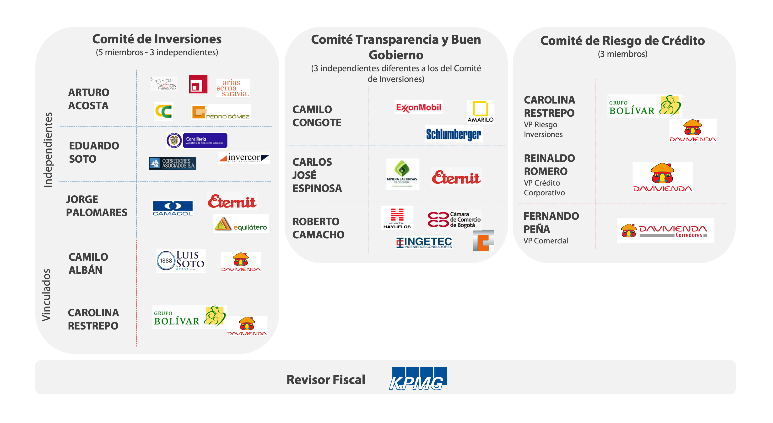 Comité de Riesgos: tiene como objetivo evaluar los potenciales arrendatarios del Fondo y su nivel de riesgo emitiendo un concepto de los mismos para el Comité de Inversiones; igualmente hace seguimiento a la situación financiera de cada uno de los actuales arrendatarios del Fondo y define las políticas de provisiones y castigos de cartera. Este Comité se realiza para ser un referente de buenas prácticas en la industria.