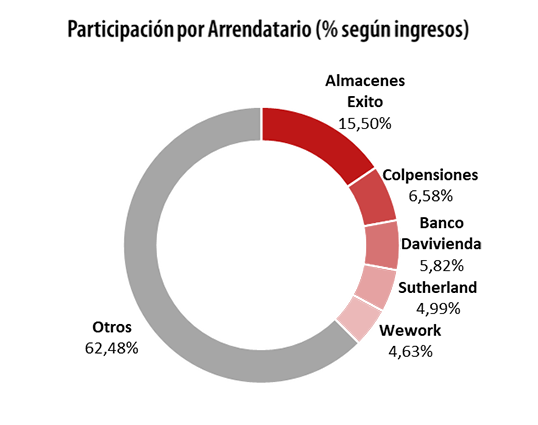 Los principales arrendatarios del Fondo son Almacenes Éxito con el 15,50% de los ingresos, seguido por Colpensiones (6,58%),
