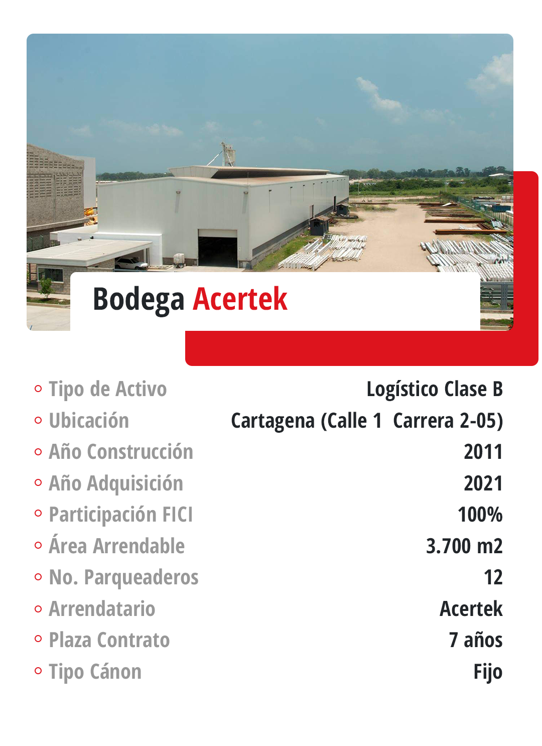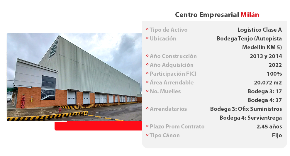 Logístico e industrial: El portafolio cuenta con dos bodegas en las que cuatro arrendatarios desarrollan su negocio. A estas dos bodegas se les suman otras dos bodegas que fueron compradas este semestre en el Centro Empresarial Milán.