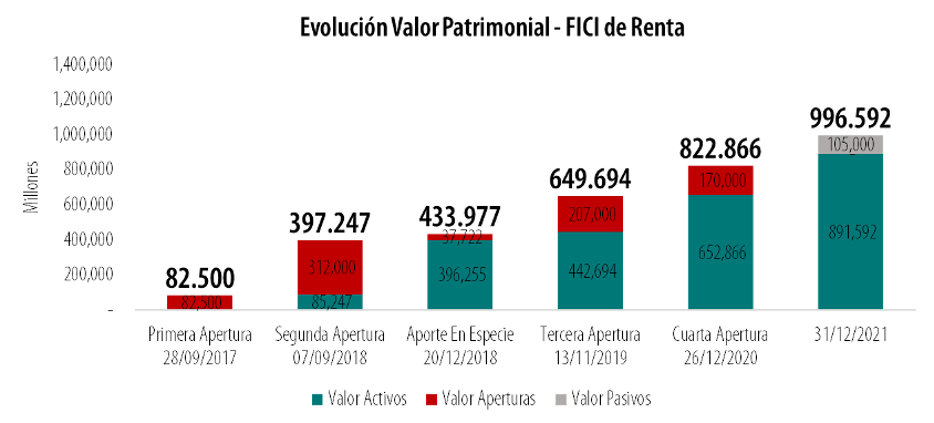 Durante el primer semestre del 2022 el valor patrimonial del vehículo tuvo un incremento a razón de la valorización de los inmuebles, obtenida mediante el incremento diario en el valor de la unidad, reflejando la variación de la UVR que es la forma de actualizar diariamente el valor de los activos a mercado con la inflación, los ajustes realizados por los avalúos y las actualizaciones trimestrales llevadas a cabo por 414 Capital, el valorador independiente del portafolio, así como las valoraciones mensuales de los patrimonios autónomos. Por otro lado, el valor de los pasivos también aumentó con la adquisición de dos nuevas deudas a corto plazo en lo corrido del año que suman $49.500 MM las cuales fueron tomadas para la adquisición de los nuevos activos.