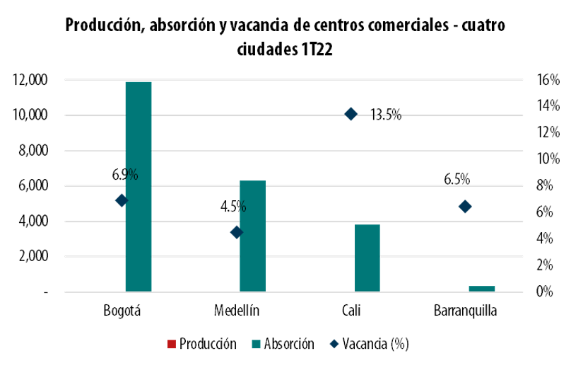 Desde el tercer trimestre de 2021, el mercado de centros comerciales ha mostrado una recuperación gradual, reflejada en los niveles de ocupación de locales y en la consecuente disminución de la disponibilidad de estos. Durante los tres primeros meses del año en Bogotá, Medellín, Barranquilla y Cali hubo una disminución en las tasas de vacancia frente al mismo periodo de 2021, pasando del 8.1% al 6.9%. De igual manera, esto se vio reflejado en la ocupación (absorción) de locales comerciales, que alcanzó una cifra de 22.322 m2 hasta marzo, 20.600 m2 más ocupados frente al primer trimestre de 2021, respondiendo a un desempeño favorable en los mercados de Bogotá y Medellín, los más grandes en Colombia.