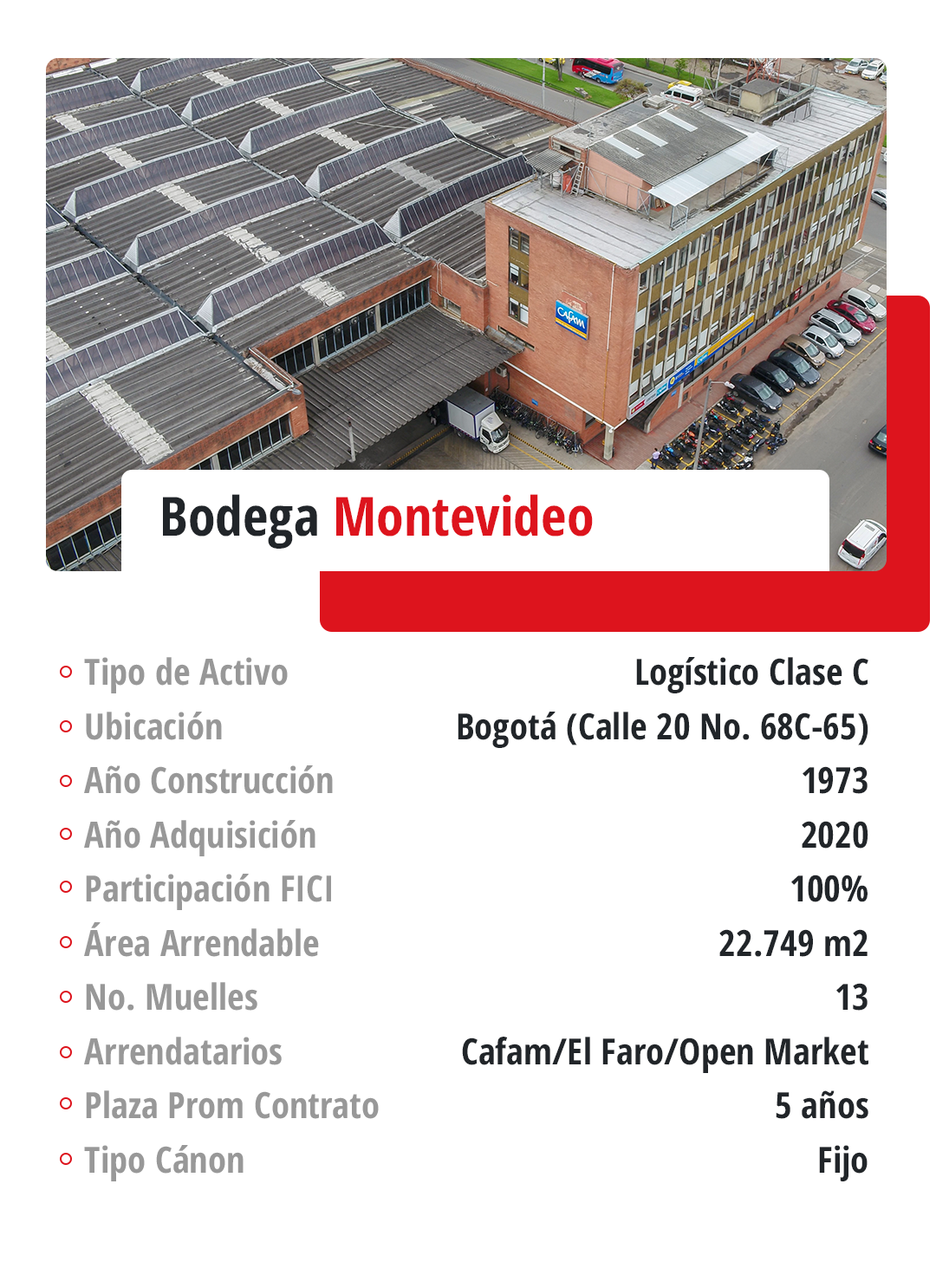 el 14 de marzo de 2022 se adquirieron dos bodegas en el corredor Calle 80 en Bogotá, el